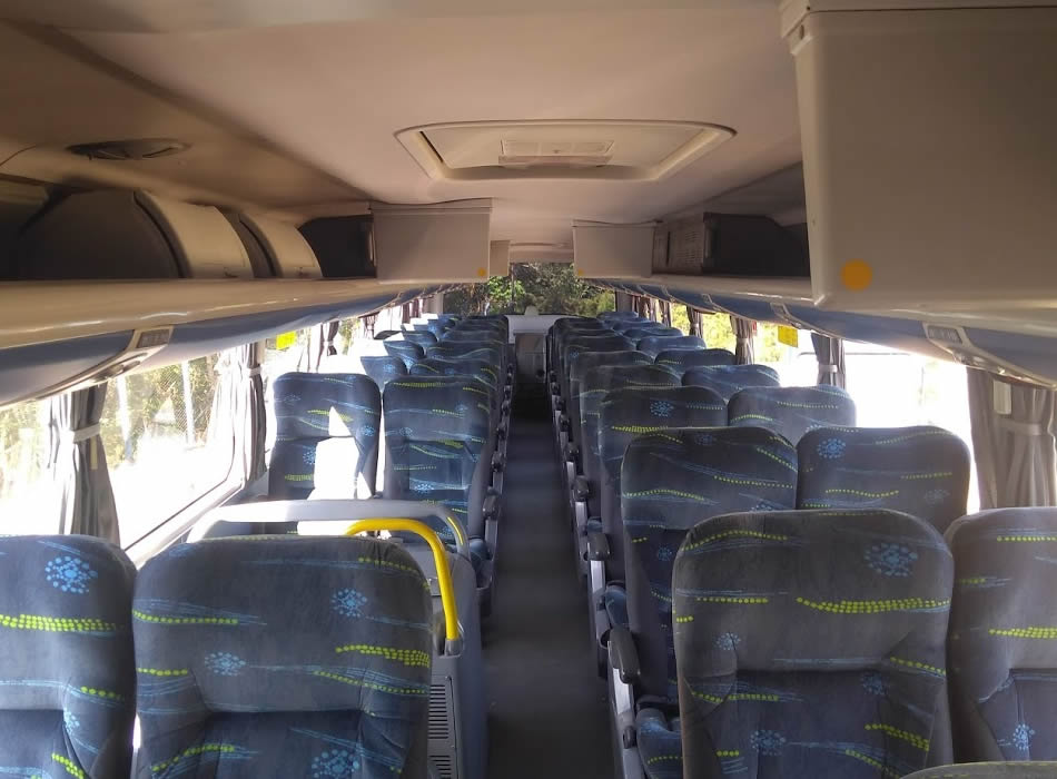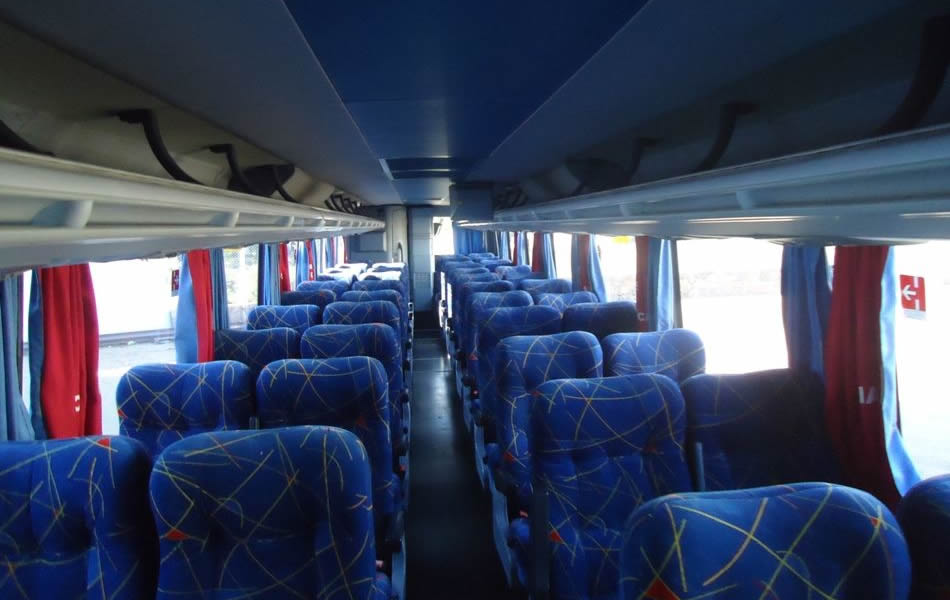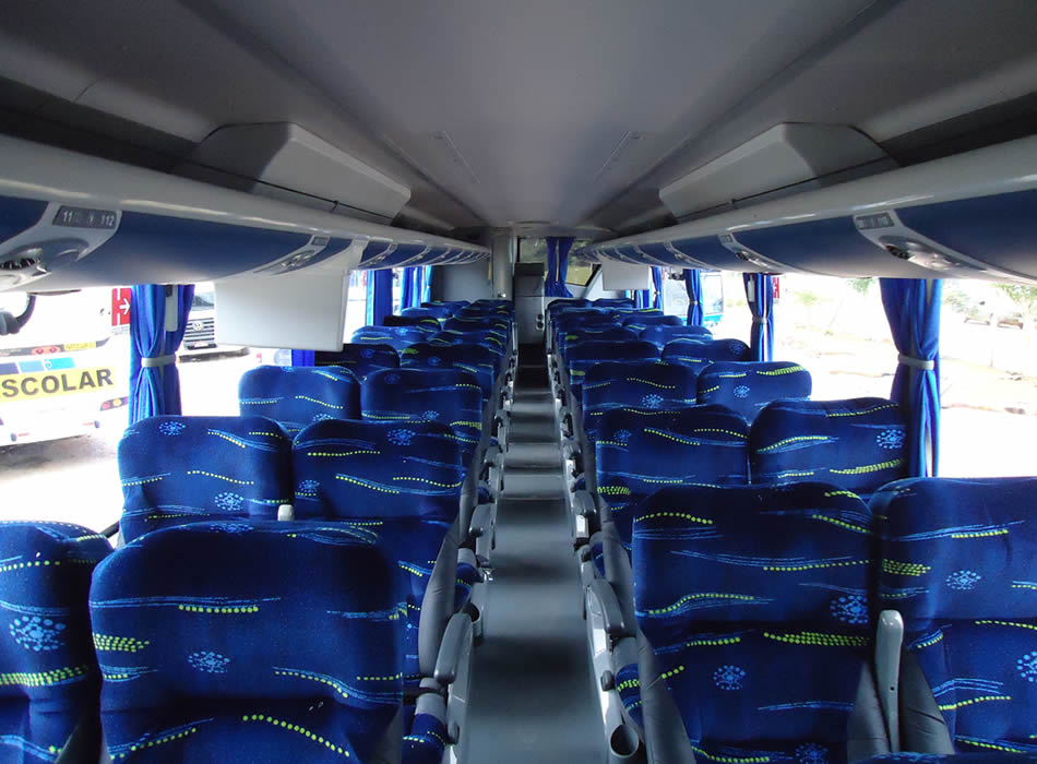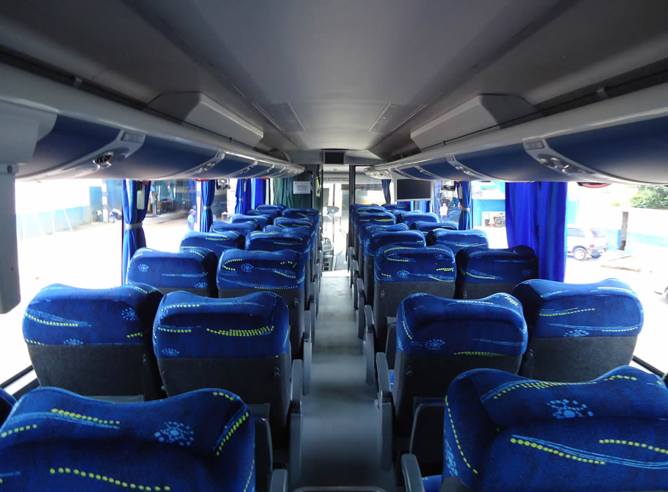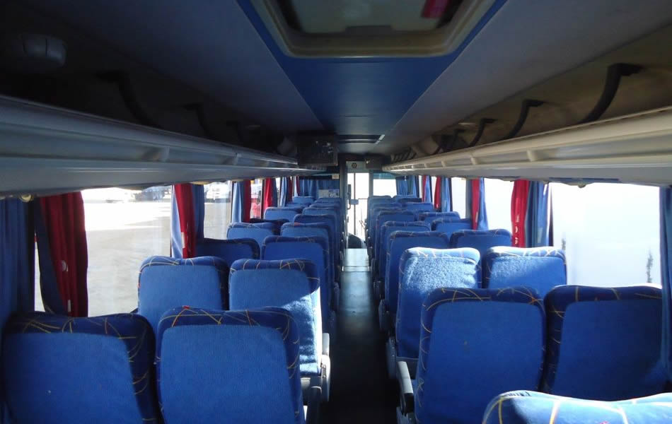 - 46 lugares, ar-condicionado, WC,cd Player, som independente para o salão de passageiros, poltronas reclináveis, monitores TV com DVD, janelas panorâmicas com película fumê, geladeira.