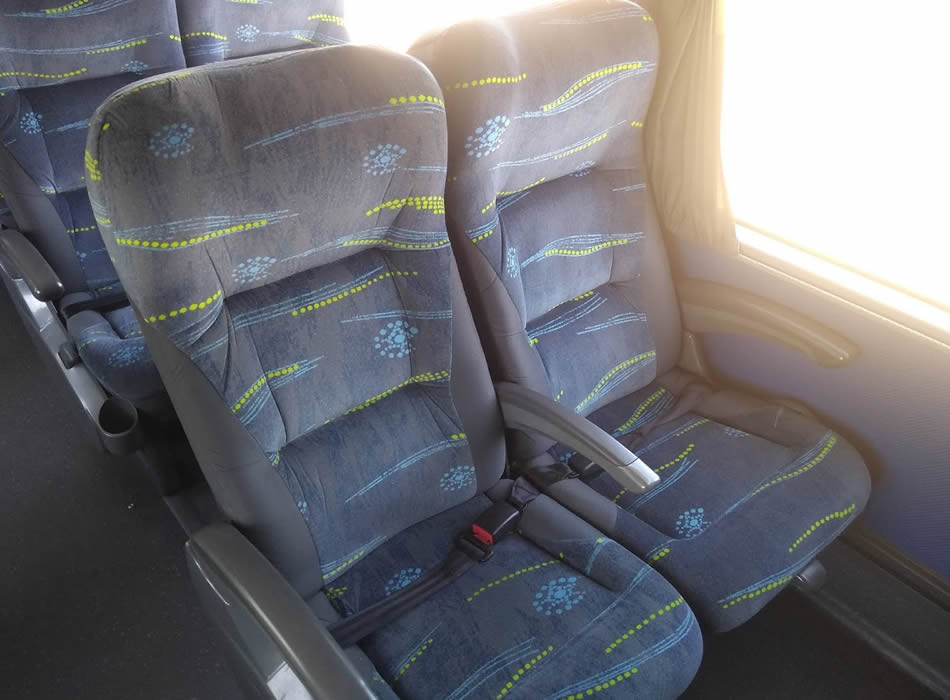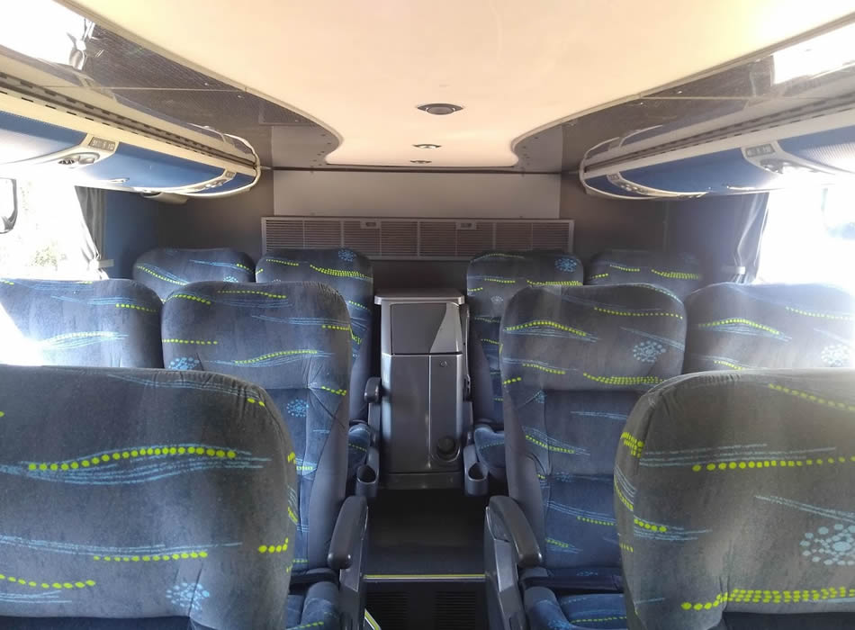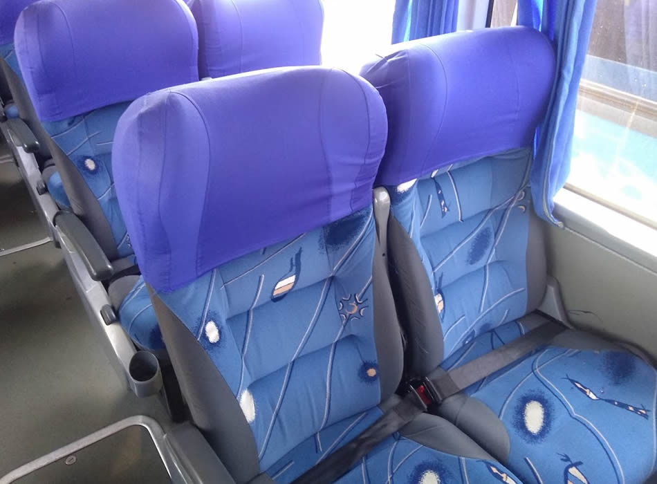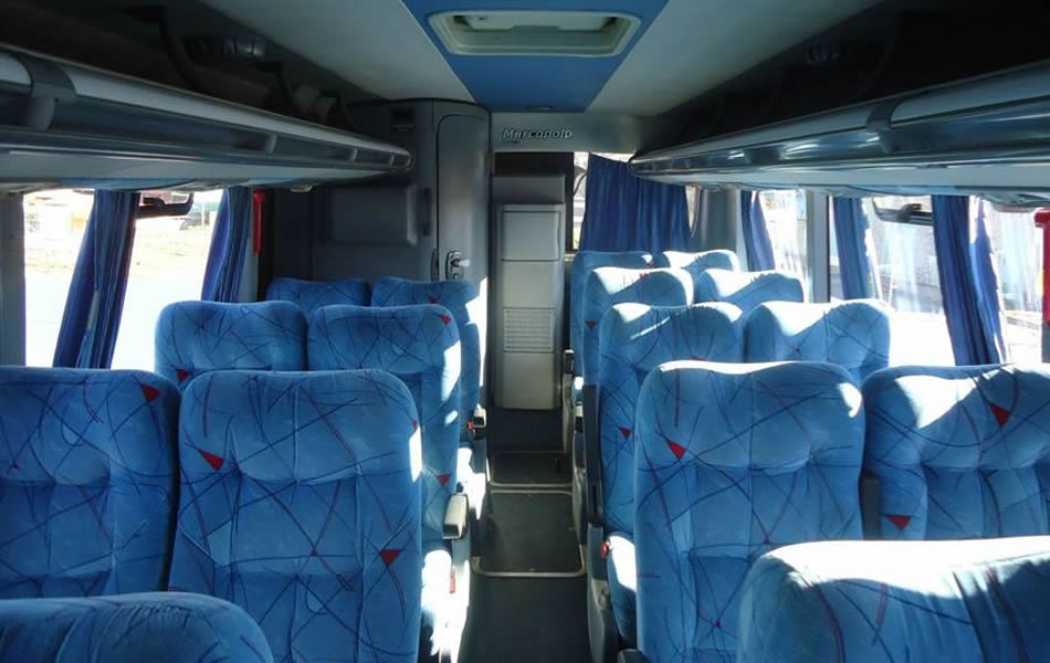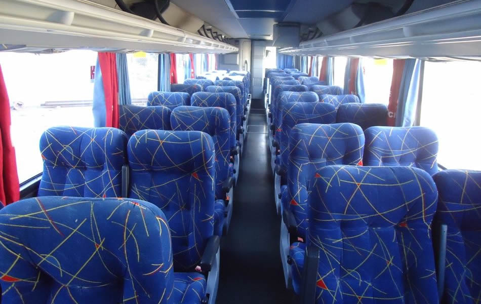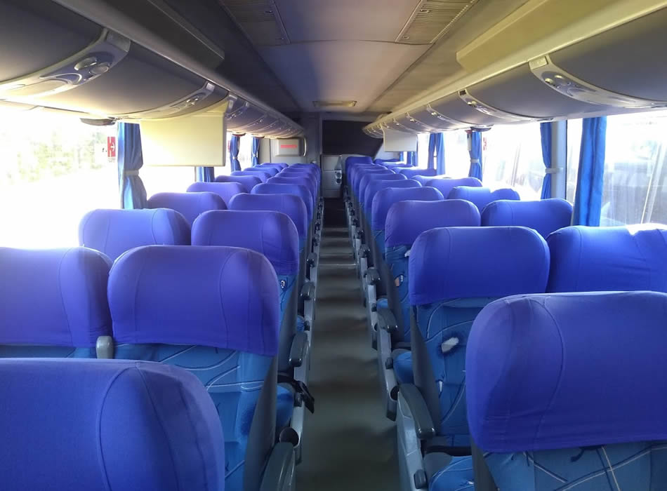 - 46 lugares, ar-condicionado, WC,cd Player, som independente para o salão de passageiros, poltronas reclináveis, monitores TV com DVD, janelas panorâmicas com película fumê, geladeira.